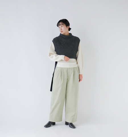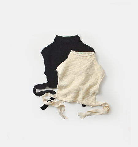 unfil(アンフィル)より、ランダムウールコットンハイネック2way ベスト “random wool & woolen cotton high-neck vest”のご紹介です。袖口や裾、衿ぐりのロールディテールが柔らかな印象を与えるハイネックベスト。脇の紐を結ぶことでベストとして、解けばネックウォーマーのようにアウターの上からも着用できる2WAY仕様です。シンプルな装いに立体感と温もりを添える、洗練されたアイテムです。