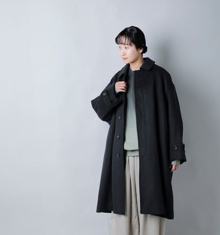 軽やかなメルトン素材は前を開けて着ても自然に落ち、ほどよいドレープが生まれます。ロング丈ならではのゆるやかなラインが、日常の動きにやさしく寄り添うシルエットです。