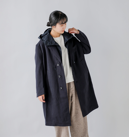 従来のチェスターコートのボディに取り外し可能なフーディーが特徴的です。それぞれ単体でも使用可能で様々なシーンで幅広く活躍します。密に織り上げられた厚手のウール・エラスティック生地を用い上品な仕上がりになっています。