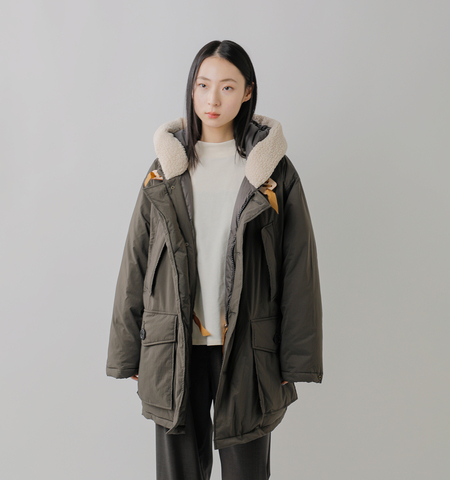 フードまわりのボア部分には、ポリエステル100%のフェイクファーを採用。ふんわりとした柔らかさと軽やかな肌触りがあり、見た目にも温かみのある質感が魅力です。保温性に優れながらも扱いやすく、デイリーに気兼ねなく着用できる点も嬉しいポイントです。