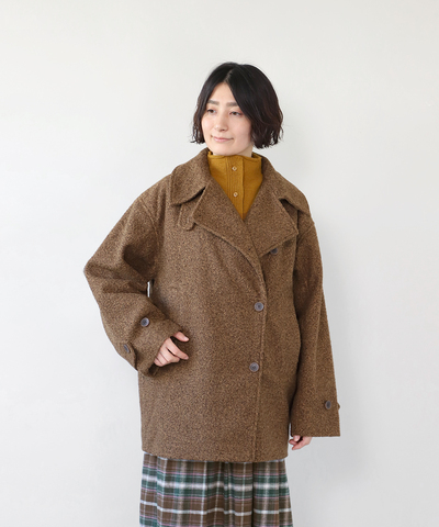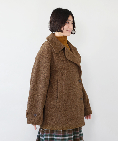 ループ織りのやわらかなブークレ生地を使用したミディアム丈のコートです。