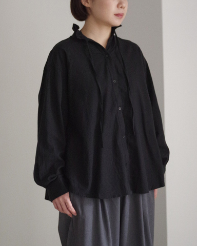 ふんわりとソフトな肌触りが特徴のピーチワッシャー地で作られたフリルシャツ。