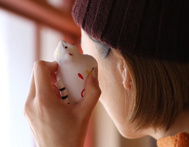 白を基調に赤や青、緑などの鮮やかな色で着色しデザインされ、独特のユルさ・脱力感がなんともいえず、その愛嬌のある表情に思わずほっこりしてしまいます。