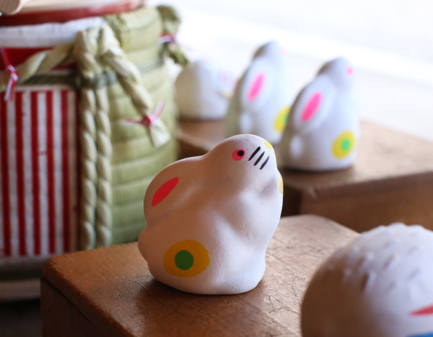 干支シリーズの卯は人形の中に玉を入れた土鈴で、振るとカランコロンと優しい音色をが聞こえてきます。天を仰ぐように上を向いて前足を揃えている姿が、とても可愛らしいです。