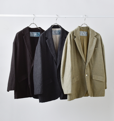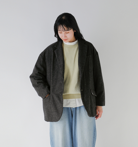 生地を織り上げた後に縮絨加工を行うことによって、ランダムな凹凸感のある風合いに仕上げた風合い豊かな素材です。オーバーシルエットなので様々な体格の方に着用していただけます。