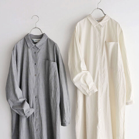 素材はやや薄手のブロード生地を使用。ハリのあるさらりとしたドライな質感が特徴で、シーズン問わず快適にご着用いただけます。ほどよいシワ感とナチュラルな風合いも魅力の一つ。一枚でのご着用はもちろん、パンツに重ねたり、羽織りとして使ったりと様々な着こなしを楽しめる一着です。