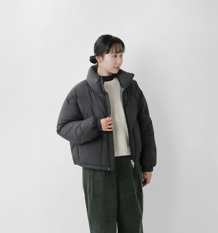 表地は経糸に20デニール、緯糸に50デニールのポリエステルフルダル糸を使用した生地を使用。合繊素材特有の光沢感を抑えたマットな表面感で肌触りもよく、着心地も軽やかな素材です。中綿はダウン90%、フェザー10%使用し、軽いのに温かさ抜群です。