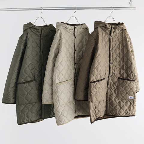 ほどよくゆとりを持たせつつ、ワイドになりすぎないよう仕上げたシルエットがスマートな印象。立体的なフードもポイントの一つで、フロントのスナップボタンを上まで留めれば冷たい風から首元を守ってくれますよ。着丈は膝が見え隠れするミドル丈。どんなボトムスともバランスがとりやすく、さっと羽織るだけでこなれた雰囲気が漂います。表と裏、両面のフロントに配されたパッチポケットの内側は、手を入れた時に冷たく感じないようフリース素材を採用。コーデュロイのパイピングが全体を引き締めてデザインのアクセントになっています。