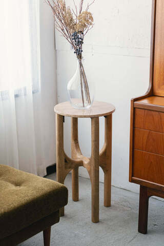 セドメット クロステーブル φ350 Highは、シリーズの中で最もスリムなハイタイプ。花器やキャンドルスタンドを飾るディスプレイ台としても映えます。クロス構造が高さのあるフォルムに安定感を与え、天然石の上質な質感が空間を引き締めます。