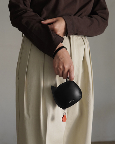 首輪の鈴をイメージしたファスナーの赤い引き手や、取り外し可能なストラップ付きで、バッグチャームとしても活躍します。実用性と愛らしいデザインでギフトにもおすすめです。