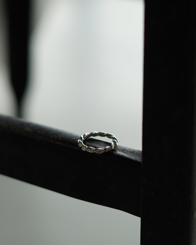 こちらは精緻なロープチェーンのディテールに見惚れるシルバーリング。編み目が最も現れた3.2mm幅。しっかりとした存在感がありながら、特有の陰影が細やかに入ることで、無骨さではなく“品のある迫力”をつくり出しています。