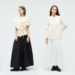 たっぷりと分量を取ったフレアシルエットが、動くたびに美しい広がりを見せるスカートのようなパンツ。 軽さのある生地とパターンミックスを演出した、大人の魅力が詰まった1枚です。