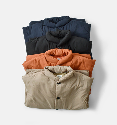 中綿をつなぐステッチのないミニマルなデザインが特徴。 表地もポリエステル100%。表面に起毛加工を施し、ウォーム感があり暖かみを感じる表情。軽くソフトで肌触りの良い素材です。