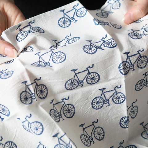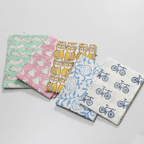 明るいエメラルドグリーンにトリ柄のブロックプリント