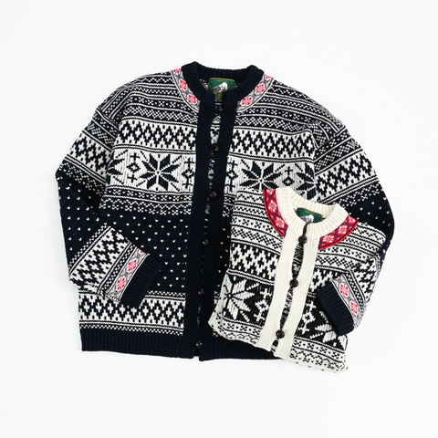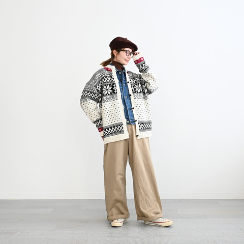 雪の結晶を伝統的なノルウェーのニットパターンを取り入れ、首元と袖口には、チロリアン柄のニットテープを施しました。