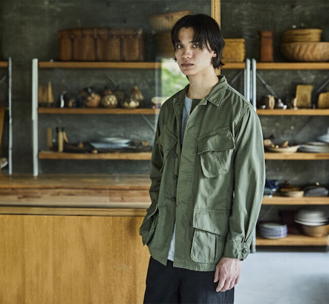 US ARMYの代表的なジャケットをベースに作成したモデル。 ミリタリーのジャケットは、作られた年代によりそれぞれ縫製仕様が異なりますが、こちらは1960年代のモデルをベースに作成しました。特徴的な部分としては袖口の明きの部分に三角のマチがついていたり、袖付けや肩の縫い仕様が巻縫いになっています。素材には実物を分析し忠実に再現しオリジナルで作成したリップストップを使っています。