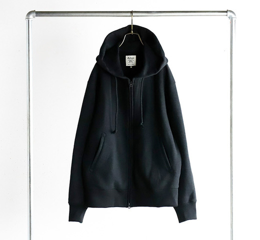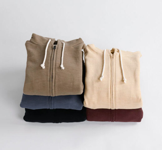 表10番、背後から見た時のフードのサイズ感、着用時の愛らしいフォルムといったスウェットパーカの持つ魅力を表現したスウェットです。素材は太番手の国産糸を使用し日本国内で編み立てたGG(ガラガラ)裏毛。粗挽きの表情が特徴的な杢カラーと肉厚感のあるソリッドカラーで展開。縫製は着用時の快適さを追究し肌に触れる主要部分は縫い代が平らになり、ごろつき感が少ないフラットシーマを採用。均等に肩への負荷がかかるように設計したフードは2枚仕立てながら重さを感じにくいのが特長です。設計はオーバーサイズに見えないように工夫しながら首周りと袖にゆとりをもたせ窮屈に感じない着用感にしました。金属製ファスナーを覆う務歯隠し、ダブルジップといったクラシカルな意匠を加え上質感を高めた仕様です。