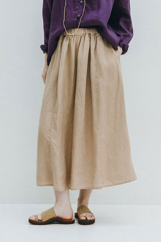 シンプルなデザインのギャザースカートは、ウエストはゴムと紐の仕様で、リラックスした履き心地。