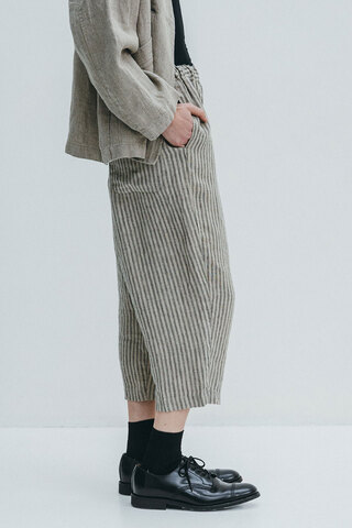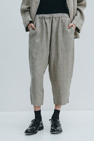 「半端丈のパンツはわたしが着用するとくるぶしがみえるくらい。素足で履いても軽やかだし、ソックスやブーツを覗かせたりするのもよさそうで、バランスが取りやすいです。らくちんな着用感でデイリーに活躍しそう」