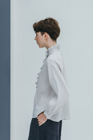 襟元と前立てにあしらったフリルが印象的なブラウス。