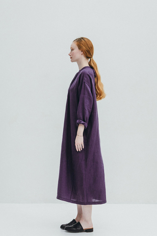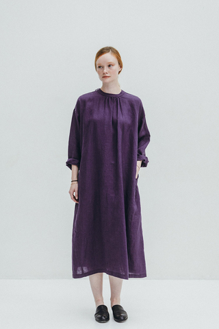 「パープルのワンピースはこれまであまり挑戦してこなかったのですが、落ち着いたトーンなので思っていた以上に着やすく、1枚でコーディネートが完成するのが楽だなと感じました。襟元のギャザーとバックのリボンが、シンプルな中にさりげないアクセントになっていてかわいいです」
