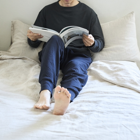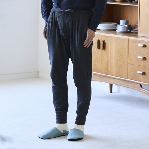パンツはテーパード型。ヒップやウエスト、太ももまわりもゆったりとしつつ、タックが入っているので縦に落ち感があり陰影も出てすっきり見えます。ウエストのゴムは良く伸び、紐付き&内側の脇にゴムの入れ替え口を付けたので、体型にあわせて調節できます。また、パンツの裾はリブだから、寝ている間にずり上がらず、足首から冷えにくいようにしました。