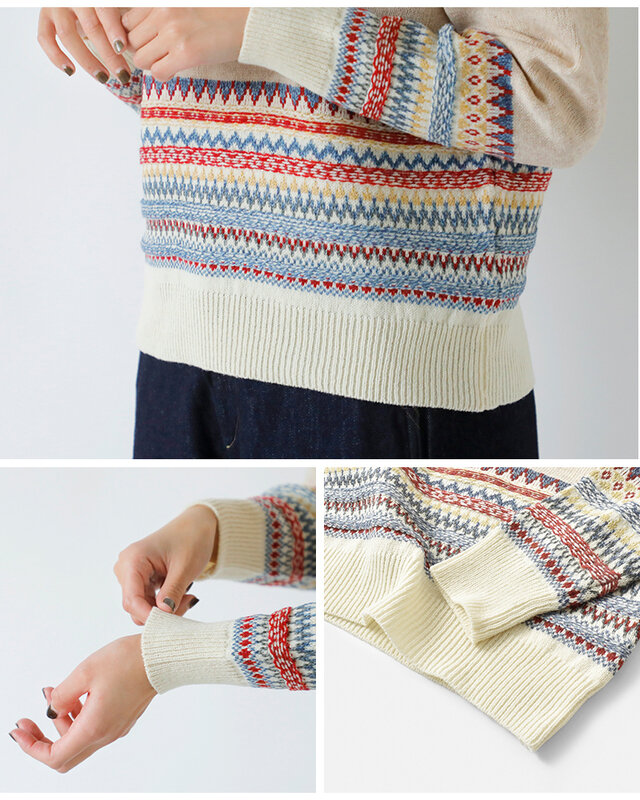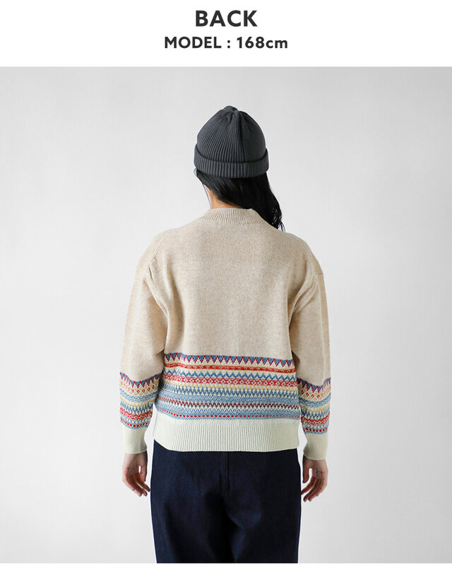 ASEEDONCLOUD(アシードンクラウド)より、セイヤコウ ジャガード プルオーバー “Seiyako jacquard po”のご紹介です。裾と袖の素敵な模様が目を引く可愛らしいニットセーター。肌触りの良いメリノウールの中でもよりソフトな質感のラムズウールを使用。 伸縮性のある柔らかな着心地と優しい温もり。ボリューム抑えめで動きやすく、 ゆとりのある身幅でドロップショルダーの、ゆったりと楽な着心地です。