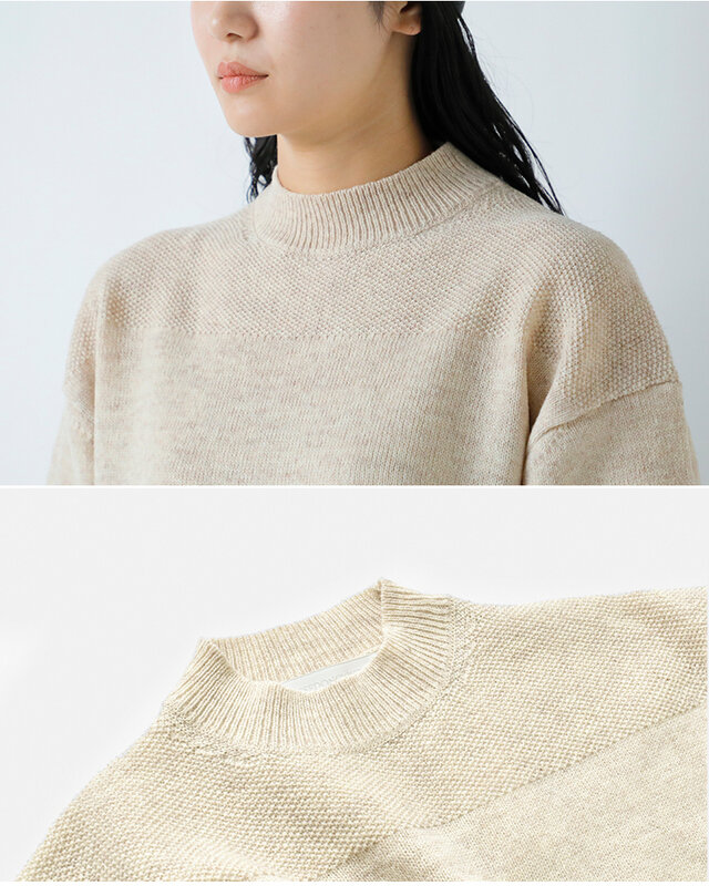 きれいなラインのモックネック。肩周りは編み目をさり気なく鹿の子編みで切り替えています。