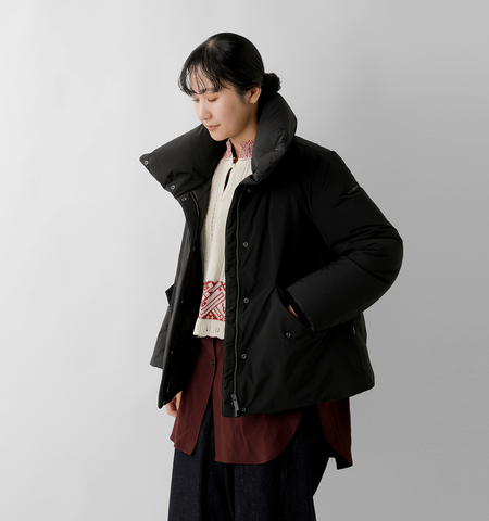 着丈をコンパクトに設計することで、重くなりがちな冬のアウターに軽快さをプラス。腰回りで自然に丸みを帯びるコクーンシルエットと相まって、小柄な方や細身の方でもバランスよく着こなせます。