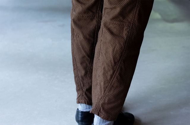 かっこいいシルエットに。股下部分や、ふくらはぎ、普通のパンツにはない切り替えがあるのは、からだの形や動きに合わせて生地を当てているため。