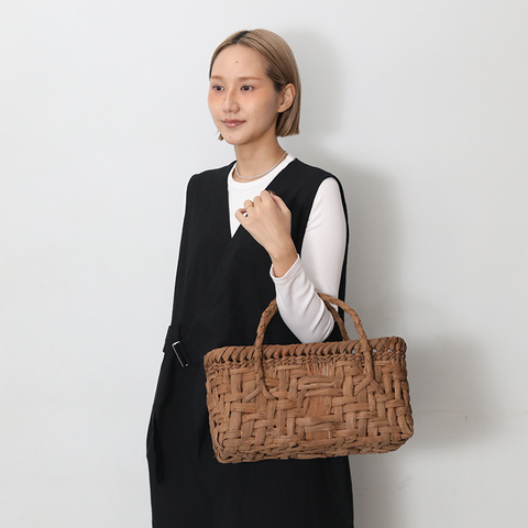 大胆に編まれた自然の力強さ感じさせるかごは、カジュアルにもエレガンスにも持ちやすく、持つ人や場所を選びません。自然を生かし作られた山葡萄かごに同じものはありません。
