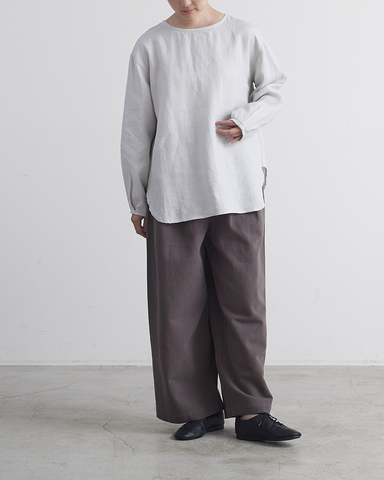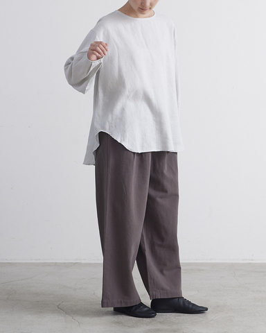 リネン100%の柔らかくシャリ感のある生地を使用したプルオーバーです 。裾がラウンドヘムになっており、カットソー感覚で気軽に着用できるデザインが魅力です 。