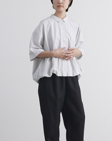 綿100%のドットジャガード生地を使用した、裾がバルーンシルエットになったブラウスです 。さりげないドット柄なので、年齢を問わず着用しやすく、日常に華を添えてくれます 。