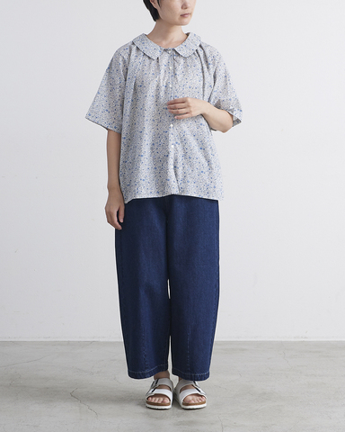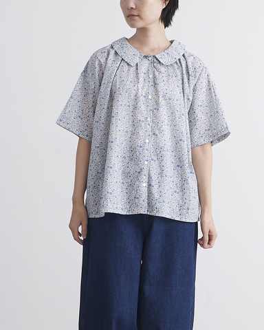大きな襟が目を惹くブラウスを、落ち着いたトーンの小花柄で仕立てました。顔周りに華やぎを与えつつ、肩のラインを華奢に見せてくれる視覚効果もあり、大人の女性が可愛く、かつ上品に着こなせる一枚です。