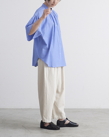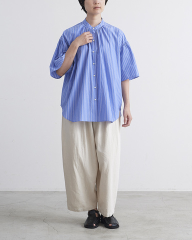 首元には繊細なギャザーをあしらうことで、顔周りに柔らかな立体感をプラス。身幅を73cmとたっぷり取ったワイド設計なので、身体のラインを拾わず、風が通り抜けるような涼しくリラックスした着心地を一日中キープしてくれます。