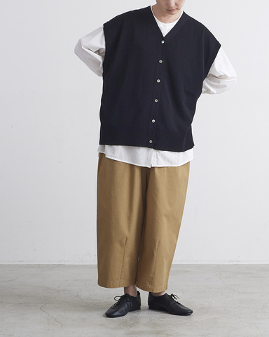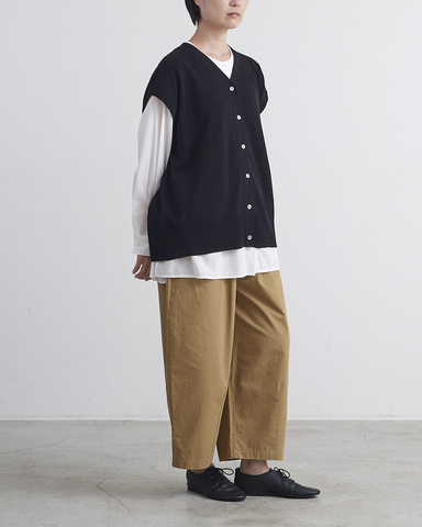 身幅はワイドな作りながら、強撚コットン特有の落ち感により広がりすぎず、スッキリとした縦のラインを強調します。アームホールも広めに取っているため、ブラウスの上に重ねても脇がもたつかず、旬のレイヤードが楽しめます。