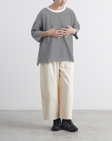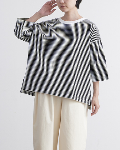 二の腕をしっかりとカバーしてくれる袖(五分袖)が、半袖を避けたい時期の強い味方に。太すぎないバインダーネックを採用することで、首元をスッキリと見せ、カジュアルなボーダーに品のあるクリーンな表情を加えています。