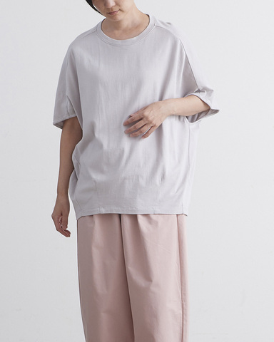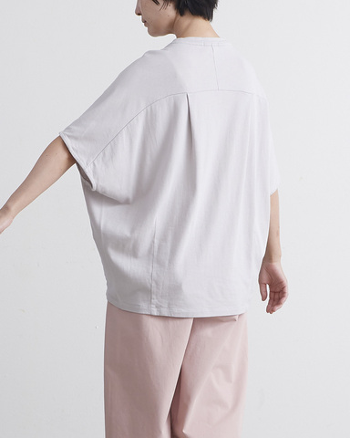 ふんわりと軽い肌当たりで着心地が良い「MVS天竺」を贅沢に使用した一着。前後に入れたダーツやタックによって、身体を丸く優しく包み込むようなコクーンシルエットを作り出し、シンプルながらもデザイン性の高い仕上がりになっています。