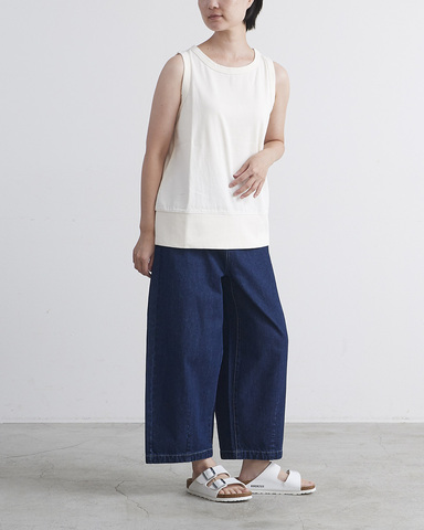 毎年多くの支持をいただく、HEAVENLY定番のタンクトップ。インナーとしての機能性はもちろん、一枚で着てもサマになるよう細部までこだわっています。特に裾に施された太めの切り替えがデザインのアクセントになり、着こなしにメリハリを与えます。