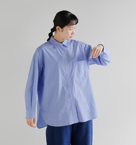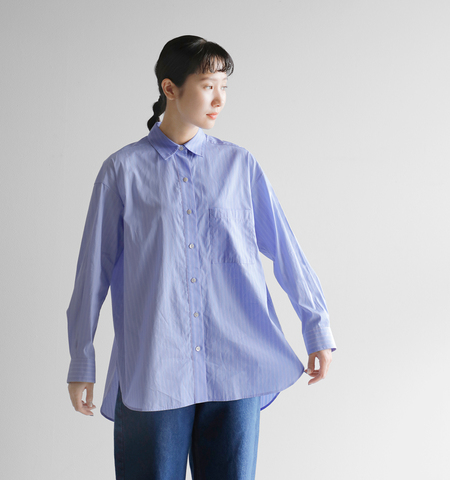 高密度に織り上げた上質なコットン素材を使用したシャツ。ストライプデザインがシンプルながら洗練された印象を演出します。ふんわりと広がるシルエットで動きやすく、着丈は後ろがほどよく長めで、どんなボトムにも合わせやすい一枚です。軽やかな着心地で、オンオフ問わず活躍します。