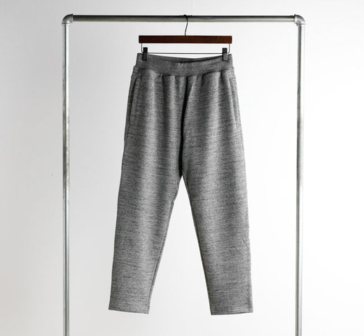 強い粗挽きの表情が特徴的な杢カラーは太さが異なる3種の糸の濃度を変えることで表現。設計はスウェットパンツの原型を踏襲しつつウエストはリブ仕様でインナーの収まりもよく、ポケットはファスナー付きで機能性をアップ。ヒップ周りや太もも周りはゆったりとしながらも膝から裾にかけてきつめにテーパーをかけすっきり見えるGGスウェットパンツの新しい形としてリリースです。