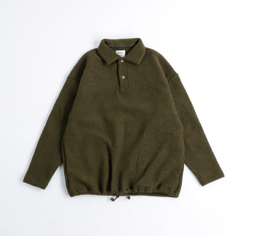 スライバー編み機を使用しウールを撚糸せずかさ高に編み上げますので温かい空気を繊維の中にとどまらせ高い保温性を発揮します。デザインは従来ウールダブルフェイスで展開していたヒモポロシャツをベースにヒモを絞ったときの着丈をベストな長さにするため+4㎝の設定です。
