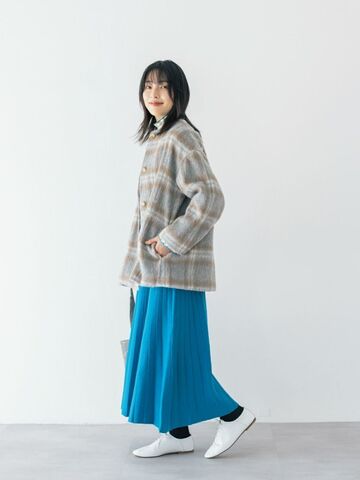 ボトムには、求心編みが印象的なブルーのニットプリーツ風スカートを合わせて、