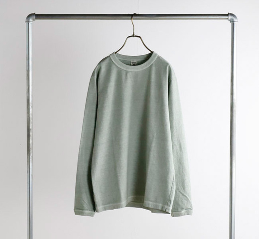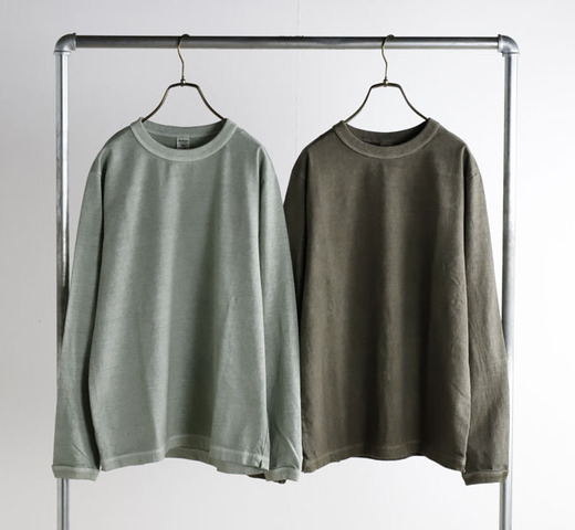 乾燥感がありザラッとした肌触りが特徴のアメリカ綿を空気紡績によって粗野な表面感に仕上げた長袖Tシャツです。首元のリブを地厚なリブに変更。表面感に合った頑丈な仕様にアップデートしました。設計の修正と縫製技術で首元の収まりがきれいになるように工夫。1枚で着用しても見栄えのするロングスリーブTシャツに生まれ変わりました。従来のポケット付きは展開しません。