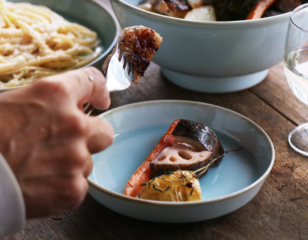 お料理を引き立たたせ、上品に見せてくれる「青白磁シリーズ」は、お皿3サイズ、平鉢3サイズ、茶碗、丼、湯呑の全部で9種類。淡い水面のような器に食材の色味がよく映えます。