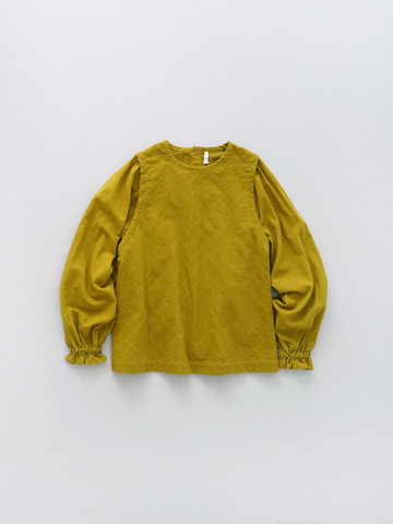 生地を二重にし、キルトステッチをかけた素材を身頃に使用したプルオーバー。ブラウスとベストを重ね着しているかのようなデザインが特徴的で、袖には薄手の柔らかな別布を用いており、部分によって素材ごとの違いを楽しむことが出来るところも魅力に。