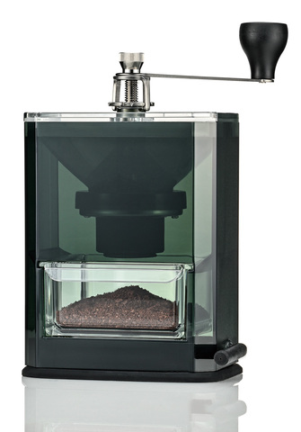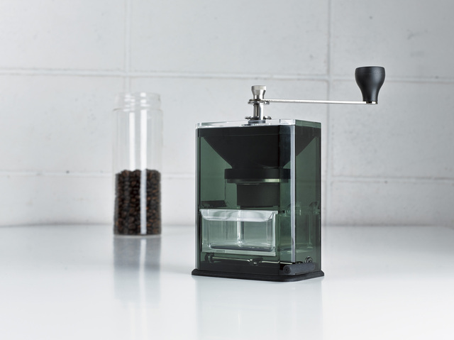 本体横のレバーを倒すことで吸盤が作動し、机に固定できるクリアな外観のコーヒーミルです。