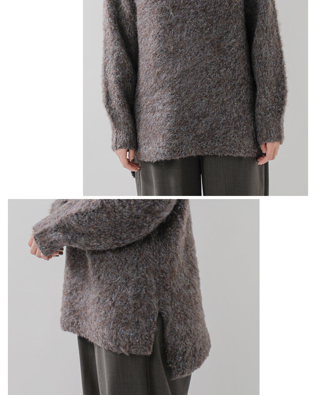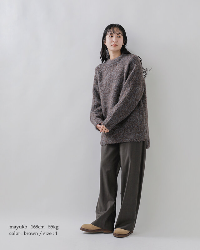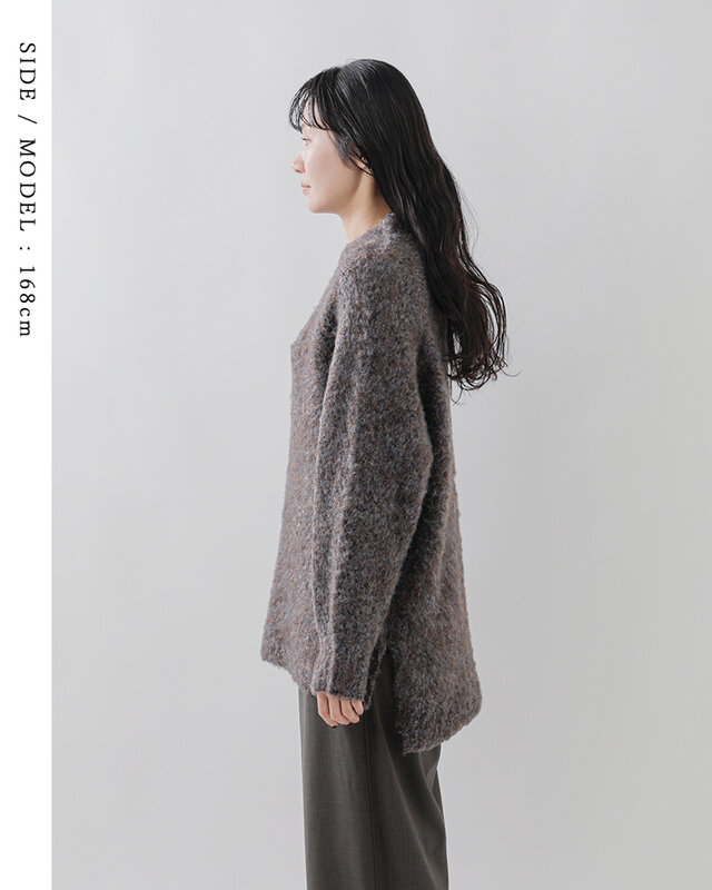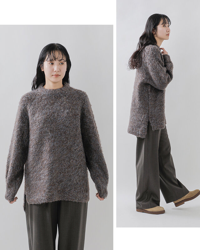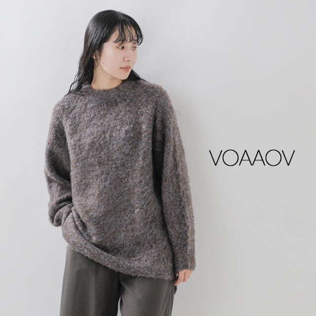 VOAAOV(ヴォアーブ)よりブークレヤーン ウール フラースチーゼル ラグラン ニット プルオーバーのご紹介です。ふっくらとした質感を生むブークレヤーンを使用し、起毛機で一枚一枚手作業にて仕上げられたこだわりの一着。手仕事ならではの空気をまとったようなふわっと軽いタッチと、優しく身体を包み込む暖かな着心地が魅力です。ラグラン仕様により肩まわりの可動性とゆとりのある表情を持たせ、リラックス感のあるシルエットへ。ゆるさの中にも品のある存在感があり、デイリーから冬のお出かけまで活躍します。シンプルなデザインだからこそ素材の良さが際立ち、長く愛用できる大人のためのニットです。