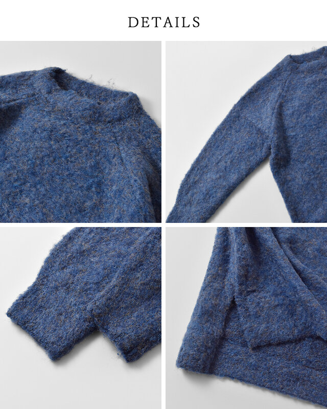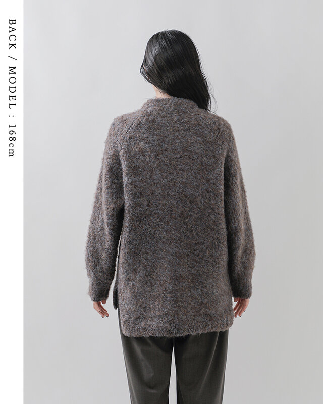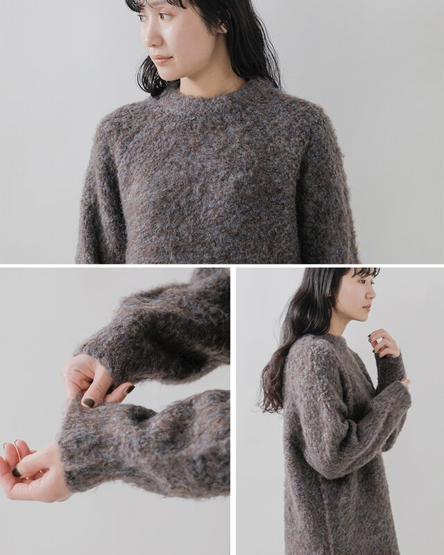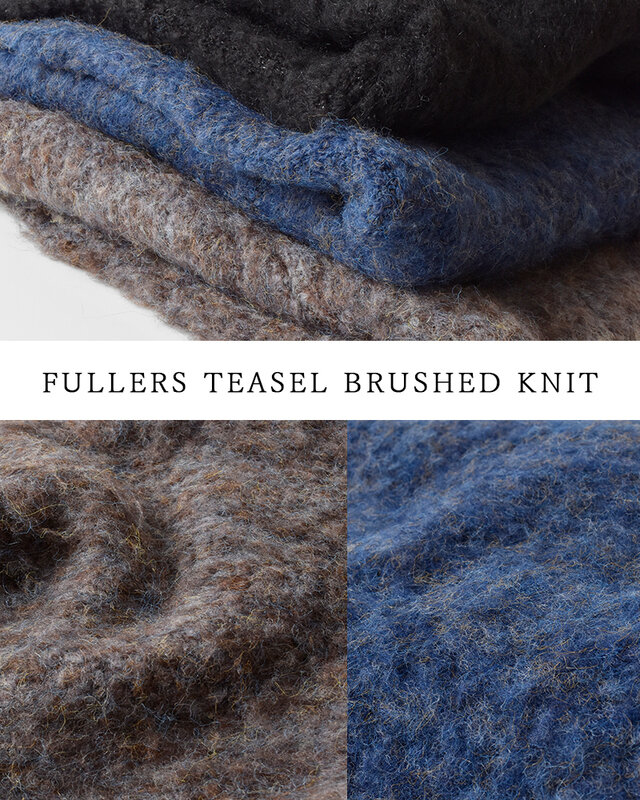 ふっくらとした質感を生むブークレヤーンを使用し、表面を棘のある植物「フラースチーゼル」を用いた一枚。起毛機で一枚一枚手作業でふんわりと仕上げた、こだわりのニットです。手仕事ならではの空気をまとったようなふわっと軽いタッチと、優しく身体を包み込む暖かな着心地が魅力です。