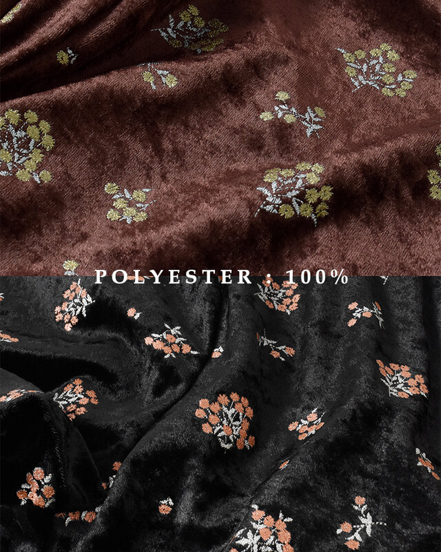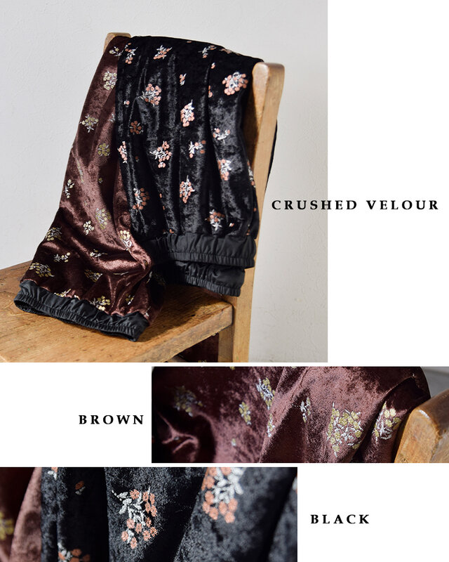 光の当たり方で表情が変わるクラッシュベロア生地に、クリープブライズという特別な手法で花柄をプリント。通常の発泡プリントよりもシャープな膨らみがあり、さりげなく輝くグリッター加工が奥行きのある美しい表情を生み出します。